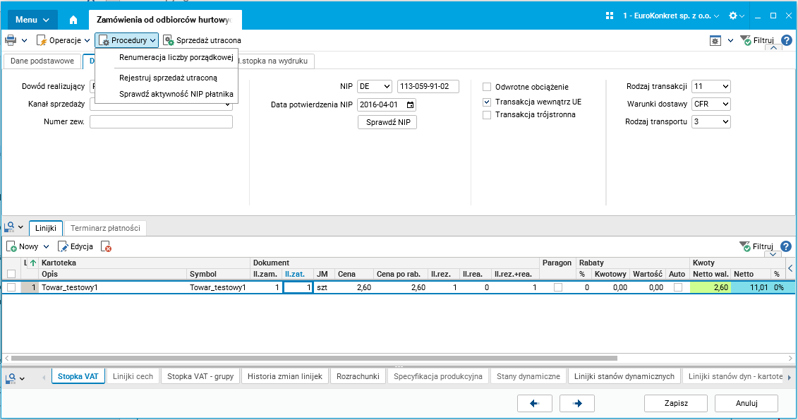 W rejestrze zamówień od odbiorców oraz rejestrze sprzedaży dodana została możliwość sprawdzania aktywności numeru VAT bezpośrednio z edycji lub podglądu dowodu. Można to zrobić za pomocą przycisku Sprawdź NIP dostępnego w zakładce Dane dodatkowe w nagłówku dowodu lub opcji Sprawdź aktywność NIP płatnika w menu Procedury. Niezależnie od ręcznej weryfikacji podczas przenoszenia do dziennika dowodów z powyższych rejestrów następuje sprawdzenie aktywności numeru VAT. Informacja jest prezentowana w szczególe Dziennik operacji na dowodach lub dodatkowo jako informacja na ekranie.