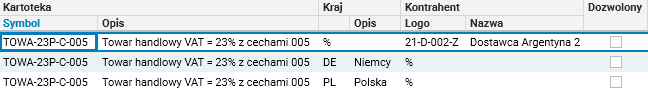 Na potrzeby zarządzania dostępnością określonego towaru w obrotach z konkretnym kontrahentem lub krajem w systemie został założony słownik Blokada asortymentu. Słownik pozwala blokować obrót towarów dla wybranych rejestrów.