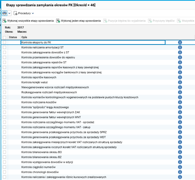 W celu usprawnienia całego procesu rozbudowano listę kontroli wykonywanych podczas zamykania miesiąca. Listę można dostosować do potrzeb firmy poprzez włączanie lub wyłączanie poszczególnych kontroli. W razie potrzeby można przygotować dodatkowe kontrole lub zmodyfikować istniejące kontrole standardowe do indywidualnych wymagań firmy.