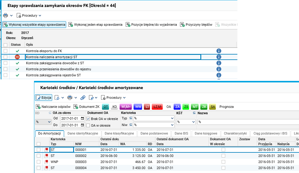 Rysunek 2. Kontrola naliczania amortyzacji ST. Pozycje błędne/Do wyjaśnienia czyli Lista środków bez naliczonej amortyzacji.