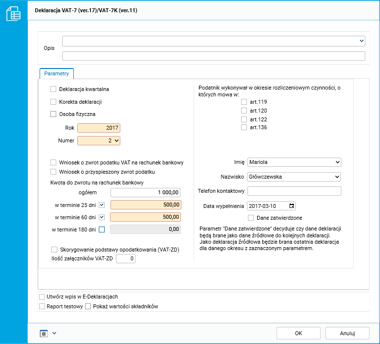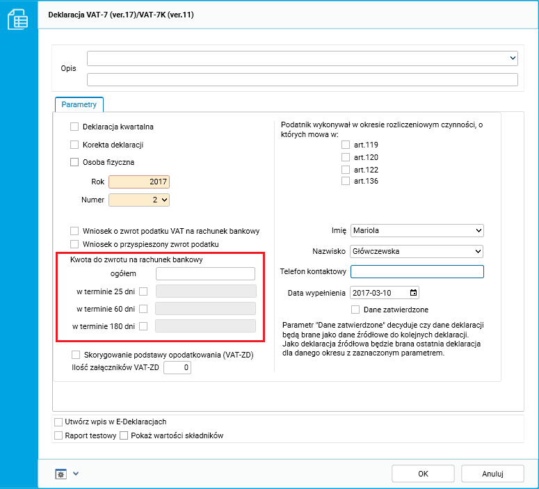 W parametrach raportu na zakładce Parametry dodano nowe opcje umożliwiające wpisanie kwoty do zwrotu oraz jej podziału na poszczególne terminy. Zmiany zostały naniesione na deklaracjach VAT-7 (16) oraz VAT-7 (17).