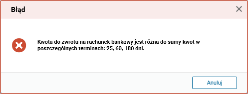 Jeśli kwota do zwrotu na rachunek będzie różna od sumy kwot wpisanych w poszczególnych terminach, pojawi się komunikat o niezgodności, jak poniżej:
