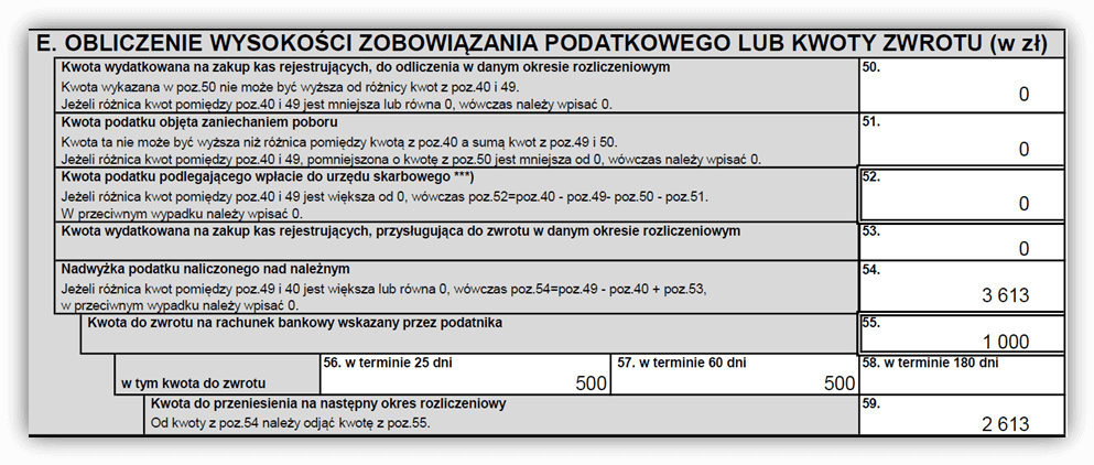 Obecnie możliwe jest wskazanie, że cała kwota nadwyżki ma być zwrócona na rachunek oraz że ma być zwrócona tylko jej część. W przypadku zaznaczenia przez użytkownika tylko jednej z opcji: zwrot w terminie 25, 60 lub 180 dni nie trzeba wpisywać kwoty do zwrotu w pola ogółem i w terminie, a kwota do zwrotu wylicza się automatycznie i jest wpisywana w pole 57 deklaracji (Kwota do zwrotu), oraz w jedno z pól 58/59/60 deklaracji (w zależności od wybranego terminu). Natomiast jeśli zaznaczymy dwie lub trzy opcje „zwrot w terminie 25, 60 lub 180 dni”, należy wpisać kwoty w zaznaczone terminy i wpisać kwotę w pole ogółem. Jeśli nie jest jeszcze znana kwota nadwyżki podatku naliczonego nad należnym, należy zatwierdzić raport bez wpisywania kwot do zwrotu. Kiedy już wiadomo, ile ona wynosi, raport należy ponownie uruchomić i podać tę kwotę wraz z kwotami w poszczególnych terminach.