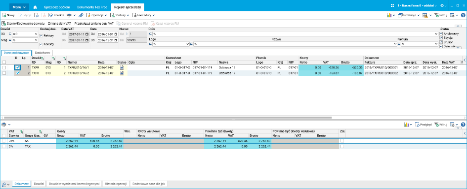 Korekty dokumentów TAX-FREE eksportowane są do rejestru VAT w analogiczny sposób, z tym że kwoty mają przeciwne znaki.
