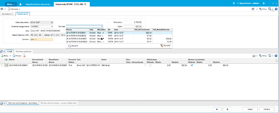 W wersji 86 nagłówki dokumentów kasowych zostały wzbogacone o nowe pole, Dokument TAX-FREE. Użytkownik ma możliwość skorzystania ze słownika Dokumenty Tax-Free podczas wystawiania dokumentu KW. Po wskazaniu dokumentu TAX-FREE następujące dane przepisywane są do dokumentu KW: