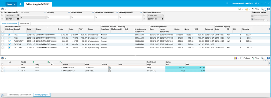 Obecnie w słowniku prezentowane są wszystkie dokumenty TAX-FREE łącznie z korektami, powiązane z nimi paragony oraz korekty paragonów, a także powiązane dokumenty kasowe. Istnienie dokumentu kasowego nie jest wymagane.