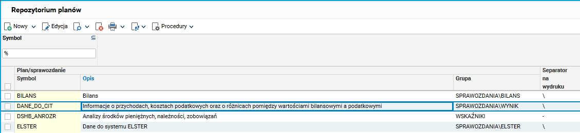 Raport Dane do CIT został dodany jako wzorzec w słowniku Repozytorium planów, skąd może być zainstalowany do wykorzystania produkcyjnego. Raport po zainstalowaniu można zobaczyć w słownikach Definicja nagłówków sprawozdań i Definicja linijek sprawozdań.