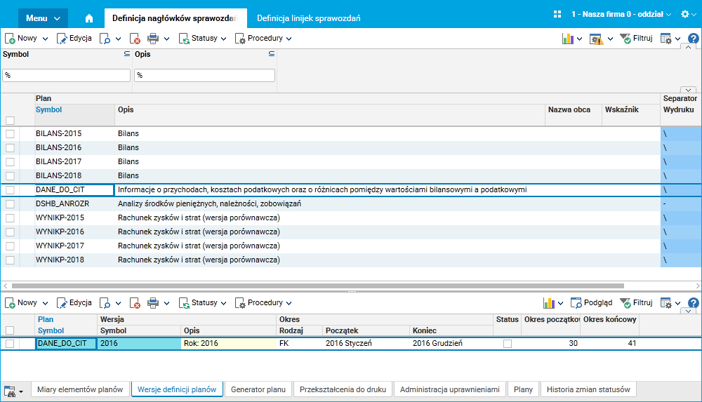 Rys. Widok sprawozdania Dane do CIT w słowniku Definicja nagłówków sprawozdań