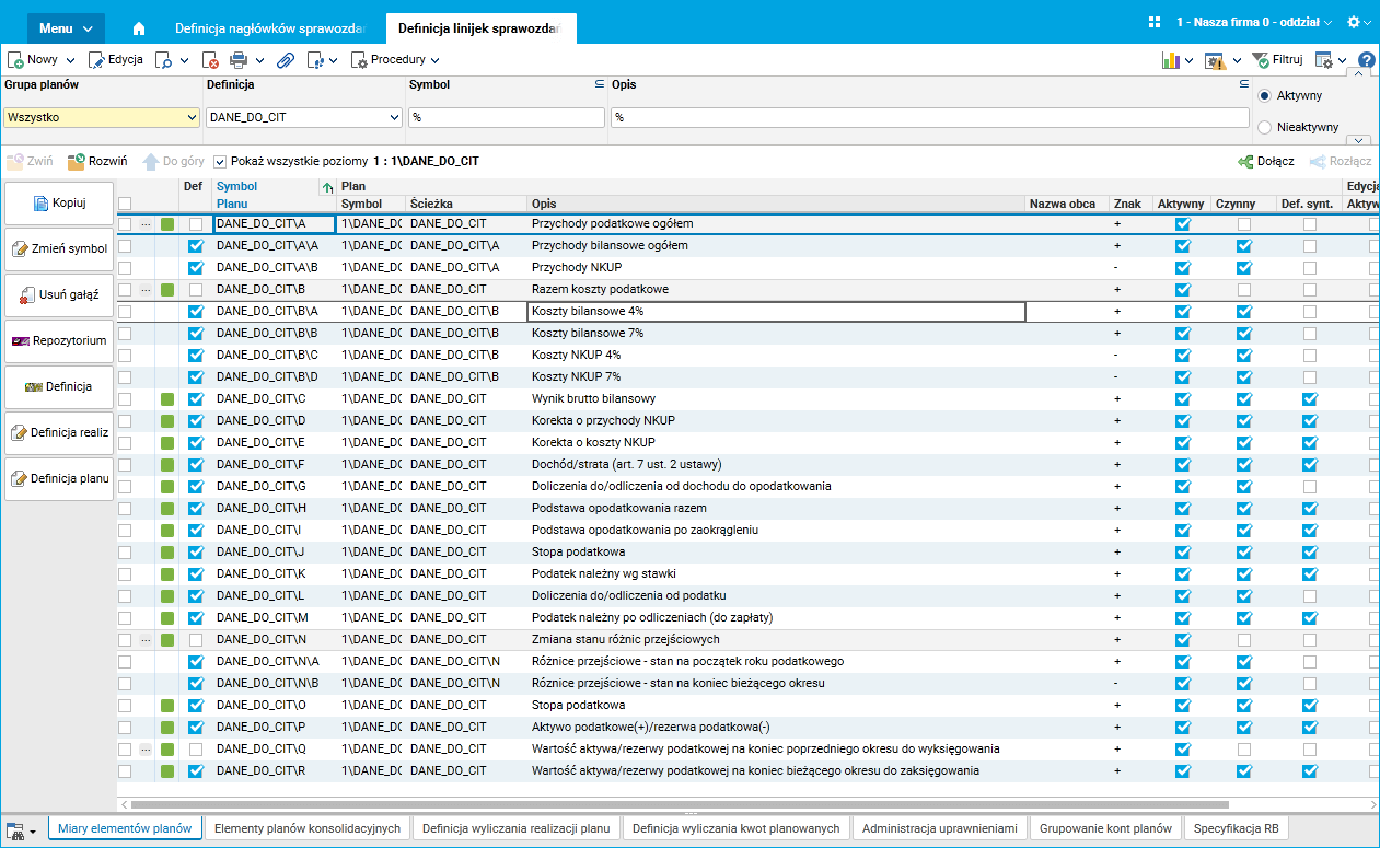 Rys. Widok sprawozdania Dane do CIT w słowniku Definicja linijek sprawozdań