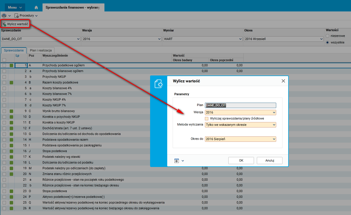 Wartości do sprawozdania można wyliczać m.in. procedurą Wylicz wartość w słowniku Sprawozdania finansowe – wybrany okres, gdzie jest możliwość obejrzenia wartości wygenerowanych dla wybranego okresu.