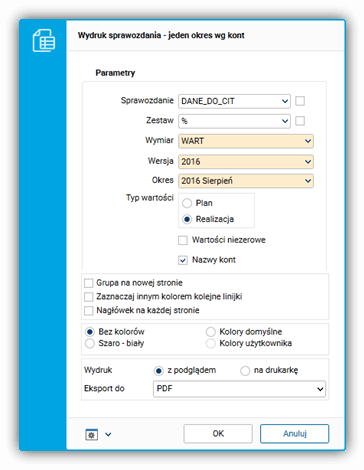 Rys. Forma parametrów wydruku Wydruk sprawozdania – jeden okres wg kont