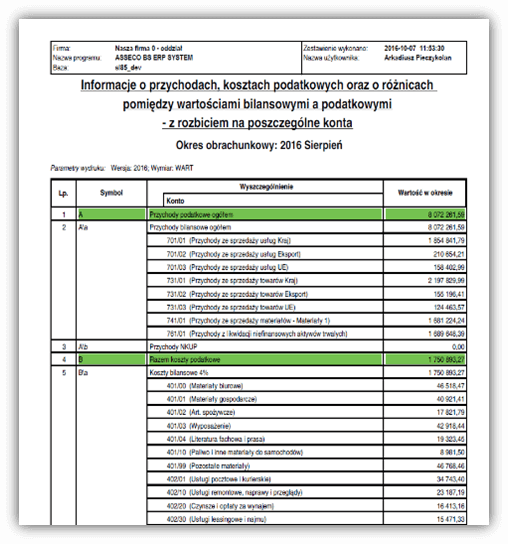 Specjalnie dodany wydruk, Wydruk sprawozdania – jeden okres wg kont, umożliwia obejrzenie kwot z raportu właśnie w rozbiciu na poszczególne konta księgowe.