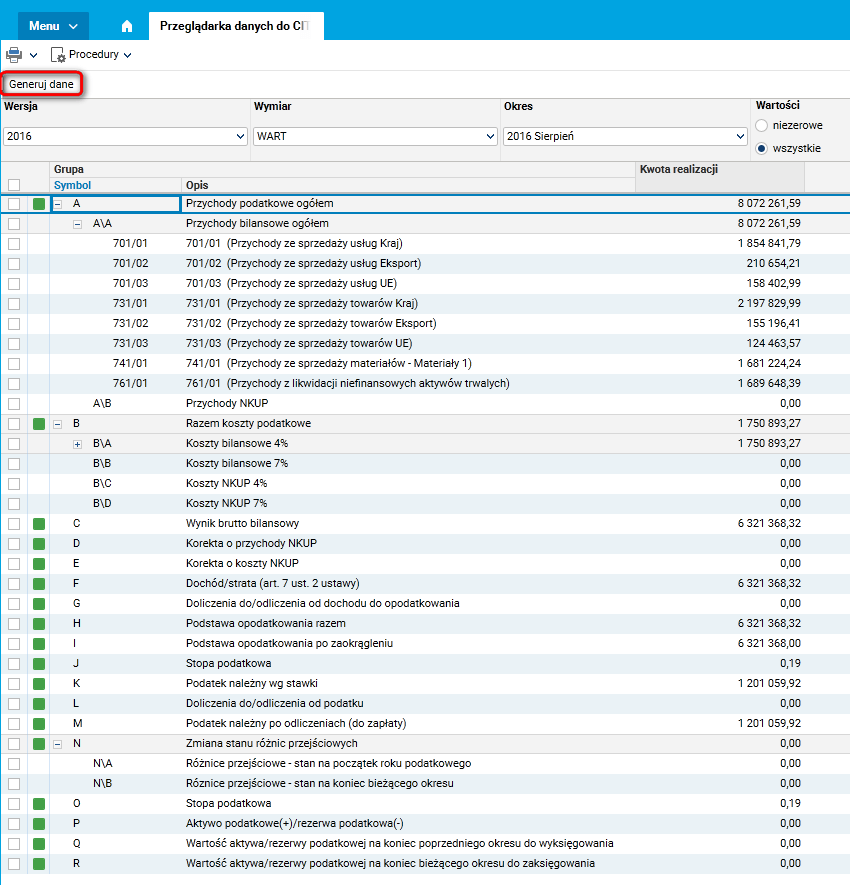 Dodano również nowy słownik, Dane do deklaracji CIT, który pozwala na przeglądanie danych z wyliczonego raportu Dane do CIT z możliwością rozbicia na poszczególne konta księgowe. Dane prezentowane są w strukturze hierarchicznej z możliwością ręcznego zwijania i rozwijania poszczególnych gałęzi tej struktury. Dodatkowo można w nim także bezpośrednio wygenerować dane do sprawozdania procedurą Generuj dane.