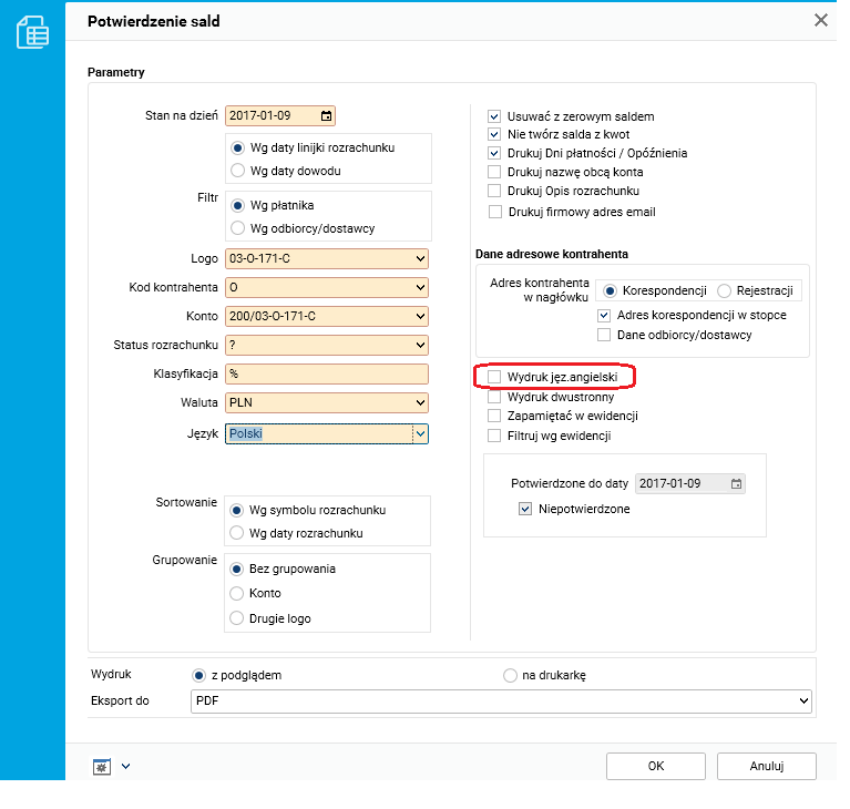 UWAGA – wyjątkowo dla wydruku wzorca Potwierdzenia salda istnieje parametr Wydruk jęz. Angielski. Odpowiada on za tłumaczenie etykiet tabeli z detalami na język angielski. Tłumaczenie jest zaszyte w samym wzorcu wydruku (plik RPT). Nie ma możliwości tłumaczenia etykiet tabelki z detalami na język inny niż angielski.