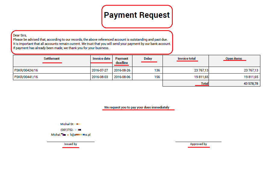 Na nowych wzorcach wydruków wezwań do zapłaty i potwierdzeń sald w zależności od wybranego języka wydruku zastosowano tłumaczenia.