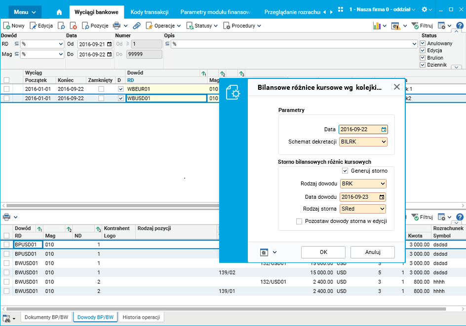 Procedura Dowód bilansowych różnic kursowych wg kolejki walut dla wszystkich w słowniku Wyciągi bankowe została rozbudowana o nowe parametry, które umożliwiają wygenerowanie dokumentów różnic kursowych dla każdego z banków wraz z dokumentami storna tych różnic.