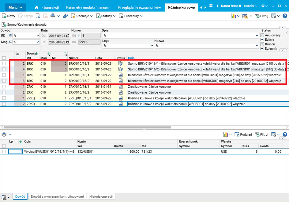 Na przykładzie pokazanym na rysunku poniżej po wykonaniu procedury w słowniku Różnice kursowe widoczne są po dwa dokumenty dla każdego z banków: dokument różnic kursowych oraz dokument storna wygenerowany przez procedurę.