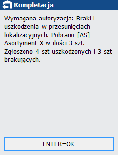 Magazynier dostał polecenie pobrania asortymentu i stwierdził, że nie ma go we wskazanej lokalizacji. Przy próbie rejestracji braku został poinformowany, że do zatwierdzenia tej operacji wymagana jest autoryzacja operatora posiadającego większe uprawnienia.