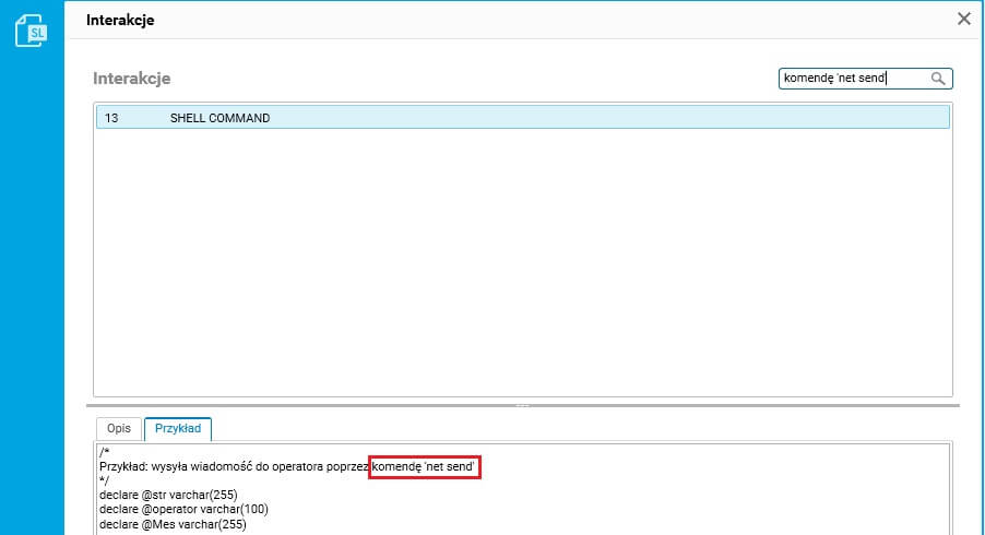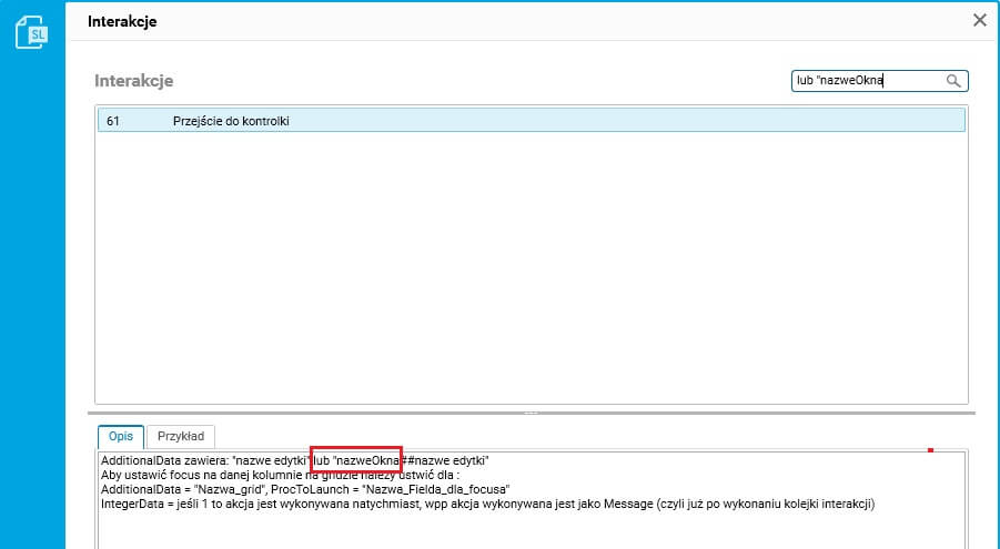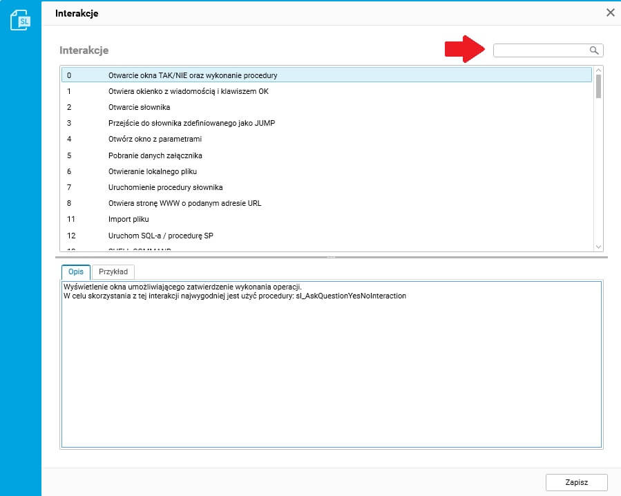W pole tekstowe należy wpisać dowolny ciąg znaków, a spis interakcji zostanie przefiltrowany na jego podstawie. Wyszukiwarka filtruje po nazwie interakcji, jej opisie i przykładzie.