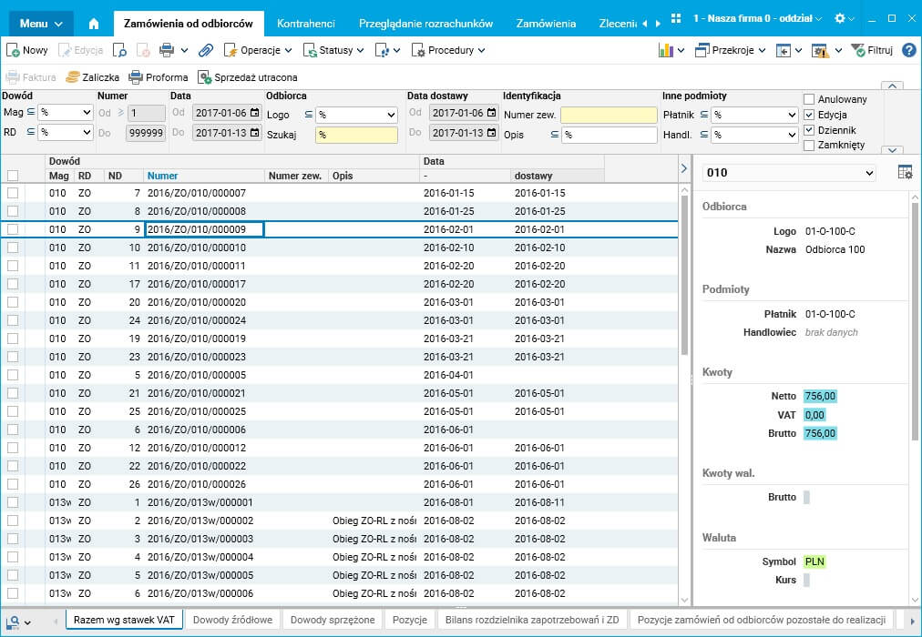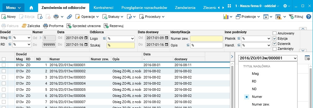W panelu informacyjnym, oprócz nazw kolumn i ich wartości dla danego rekordu, ważny jest również nagłówek. Użytkownik może wybrać dowolną kolumnę z grida jako źródło tytułu panelu dla danego rekordu. Prezentuje to poniższy zrzut ekranu (tytułem panelu jest pełny numer dokumentu):