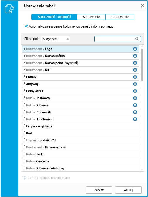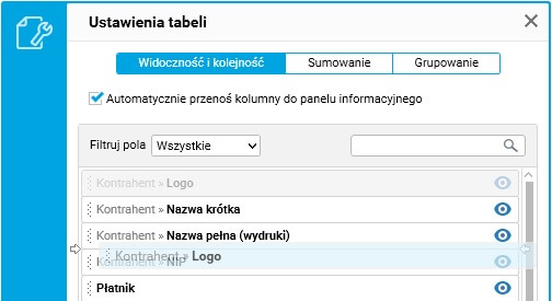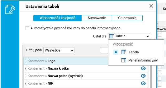 Podczas ustalania widoczności lista kolumn jest filtrowana. Ikona oka informuje o tym, czy dana kolumna pokazywana jest w tabeli (gridzie) czy w panelu informacyjnym.