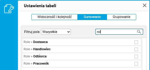 Nowością – zarówno dla sumowania, jak i grupowania – jest możliwość filtrowania kolumn za pomocą wyszukiwarki: