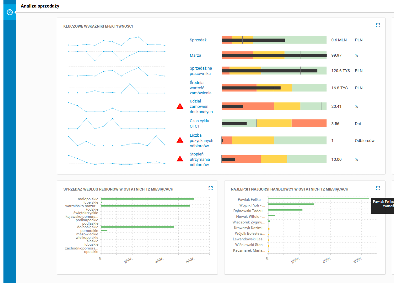 Poniżej widoczny jest przykładowy dashboard z wizualizacją wyników sprzedażowych w formie wykresów: