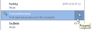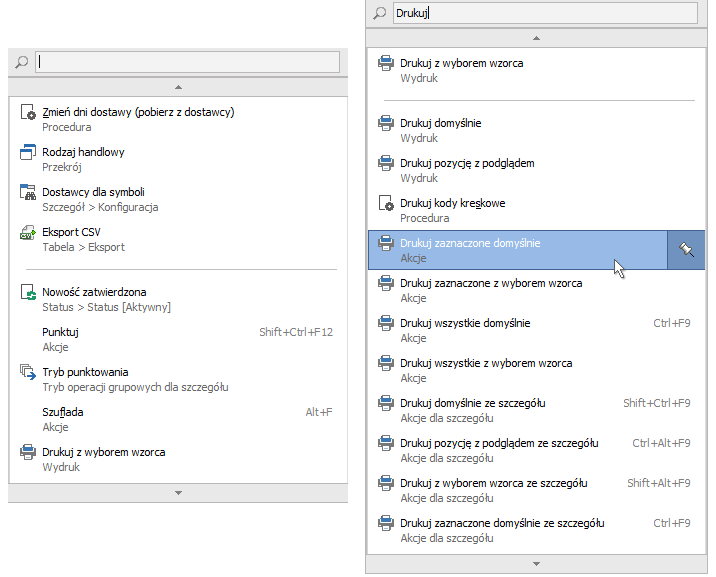 Na potrzeby tej funkcjonalności udoskonalono menu kontekstowe (popup) z wyszukiwarką, które dotychczas opcjonalnie obsługiwało m.in. menu wzorców wydruków. Elementy menu zostały wzbogacone o ikony oraz podtytuły identyfikujące rodzaj akcji. Wyszukiwarka działa zarówno na tytułach, jak i podtytułach pozycji.