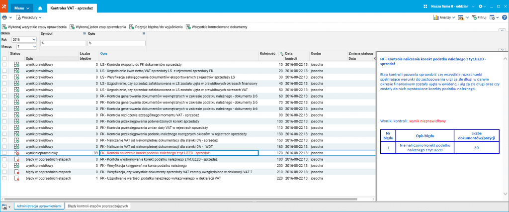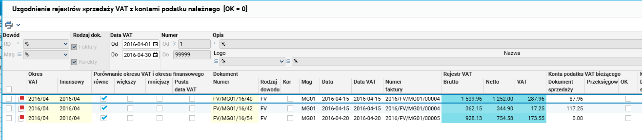 - zgodność podatku należnego i naliczonego z zapisanymi na odpowiednich kontach księgowych poprzez weryfikację wygenerowania dokumentów związanych ze zmianami daty VAT czy przeksięgowania korekt sprzedaży,