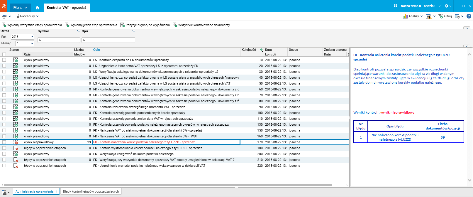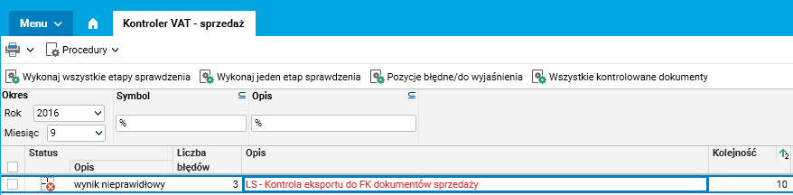 Należy uruchomić słownik „Kontroler VAT – sprzedaż” i uruchomić „Wykonaj wszystkie etapy sprawdzenia”. W przypadku zasygnalizowanego błędu należy wyświetlić słownik z listą błędnych pozycji i wykonać potrzebne poprawki. Po wykonaniu ewentualnych poprawek/modyfikacji należy ponowić wykonanie kontroli dla danego etapu i etapów po nim następujących.
