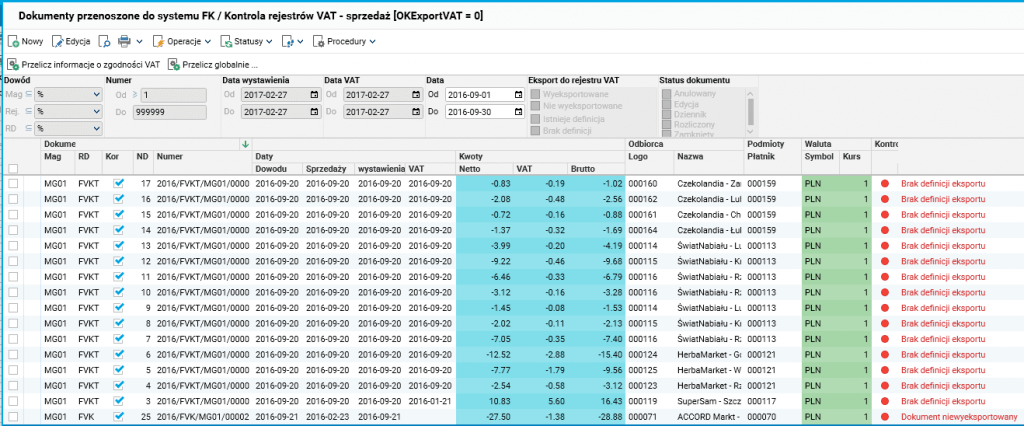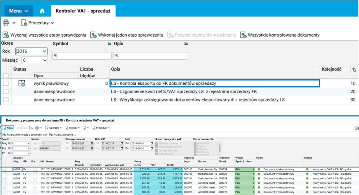 Osoba odpowiedzialna za weryfikację rejestrów VAT sprawdza czy wszystkie dokumenty (zarejestrowane w modułach Logistyka i sprzedaż, SEOD czy też Sekretariat) zostały wyeksportowane do modułu FK oraz czy kwoty netto VAT oraz daty związane z ewidencją księgową oraz podatkową są zgodne w modułach LS i FK.