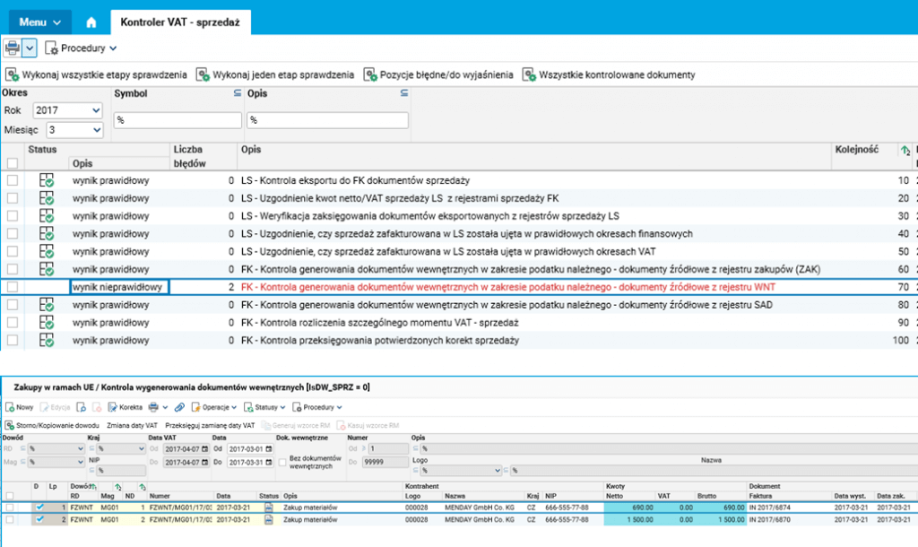 Rys. 5. Kontroler VAT – sprzedaż. Zakupy w ramach UE – kontrola wygenerowania dokumentów wewnętrznych.