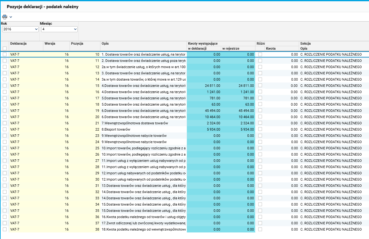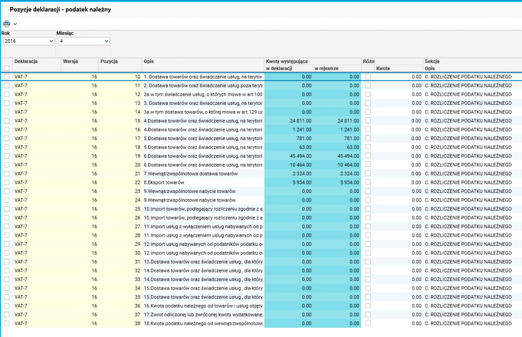 Osoba zajmująca się w firmie rozliczeniami VAT chce sporządzić deklarację VAT-7 i zweryfikować kwoty wykazywane w poszczególnych pozycjach deklaracji z rejestrami VAT.