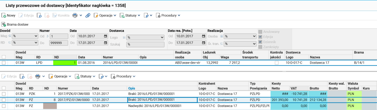 W procesie Przyjęcie dostawy i podczas jej rozliczenia w aplikacji radiowej może powstać zestaw dokumentów PZ i PZK. Żeby można było łatwo rozróżnić, które dowody rozliczają nadwyżki, a które braki, zostało to zapisane w opisie dowodu.