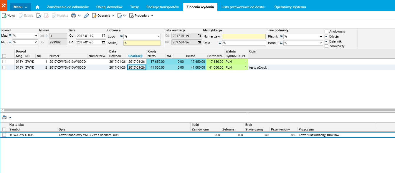 ·         Brak stwierdzony – ilość towaru, która została podana jako brak na stanie magazynu,
