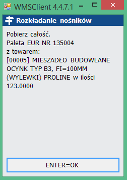 W procesie Rozkładanie nośników została dodana możliwość wyświetlenia na ekranie z informacją Pobierz całość dodatkowej informacji o nośniku i leżących na nim towarach. Informacja ta będzie widoczna tylko dla palet jednorodnych.