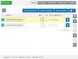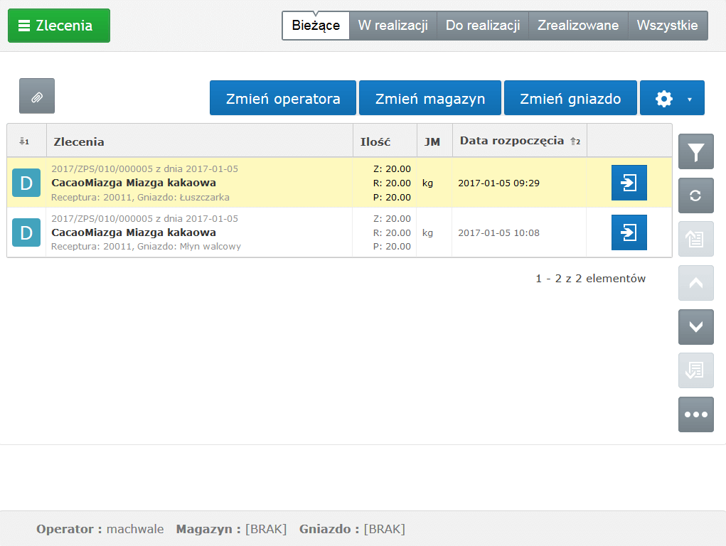 Dodana zakładka Bieżące umożliwia odfiltrowanie zleceń produkcyjnych na panelu dotykowym produkcji. Na zakładce tej widoczne są jednocześnie zlecenia o statusie Do realizacji oraz W realizacji.