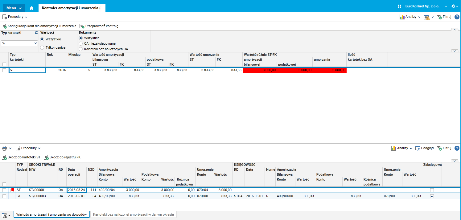 W czytelny sposób zostały zestawione wartości zebrane z modułu „Środki trwałe” i porównane z wartościami na kontach w „Finansach i księgowości”. Dzięki specjalnym filtrom można zobaczyć czy istnieją kartoteki bez naliczonej amortyzacji lub czy mamy wartości naliczone ale niezaksięgowane. Kwoty, które nie są ze sobą zgodne są wizualizowane czerwonym kolorem. W ten sposób użytkownik otrzymuje na bieżąco informację o miejscu powstania potencjalnych błędów.