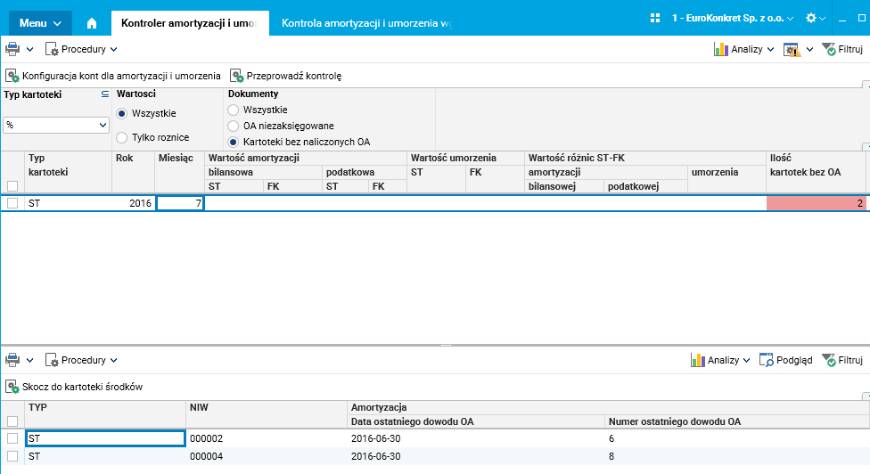Otwiera słownik „Kontroler amortyzacji i umorzenia” i wykonuje procedurę Przeprowadź kontrolę. Dane prezentowane w oknie pogrupowane są po rodzaju kartoteki, a informacje pochodzące z modułów ST i FK są prezentowane w jednej linijce.
