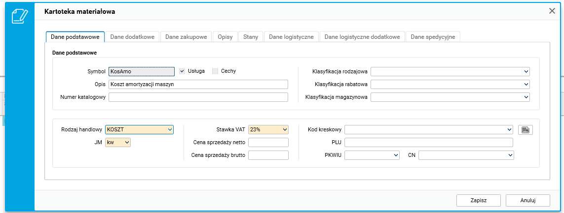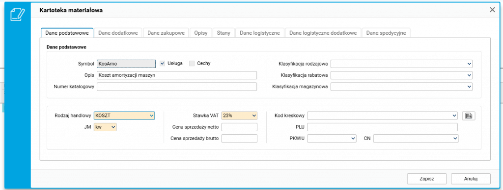 Mając zdefiniowane grupy kosztowe w procesie technologicznym, przystępujemy do ich zarejestrowania w systemie z poziomu kartotek materiałowych. Istotne jest, aby wprowadzane kartoteki miały przypisany rodzaj handlowy „Koszt”.