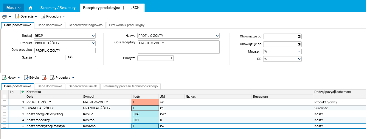 Aktualizujemy zdefiniowane w systemie receptury produkcyjne wprowadzając do nich dodatkowe pozycje kosztowe. Zmiany realizujemy poprzez przeniesienie dokumentów do edycji i wprowadzenie pozycji kosztowych, do tego celu możemy również wykorzystać procedurę Kopiuj recepturę. Użycie procedury zarejestruje nową wersję receptury, którą rozbudowujemy o nowe pozycje kosztowe.