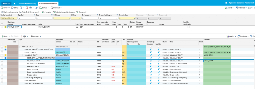 Po zapisaniu zmian i zatwierdzeniu receptury proces technologiczny zostaje zaktualizowany. Efekty naszej pracy możemy zweryfikować w szczególe Drzewo technologii podłączonym w kartotece materiałowej.