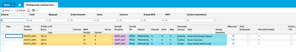 Rys. 5 Konfiguracja rozbicia kosztów – automatyczne rejestrowanie pozycji kosztowych na dokumentach PROD