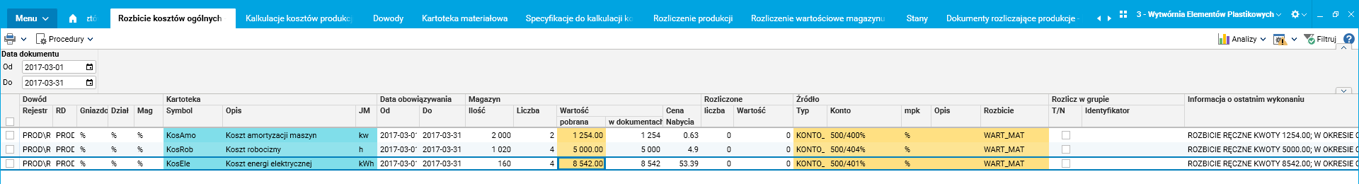 W wyniku przyjętej konfiguracji, w słowniku Rozbicie kosztów ogólnych (pośrednich), widzimy zbiorczo pobrane kwoty z modułu FK, w ujęciu grup kosztowych wykorzystanych na dokumentach rozliczających produkcję.