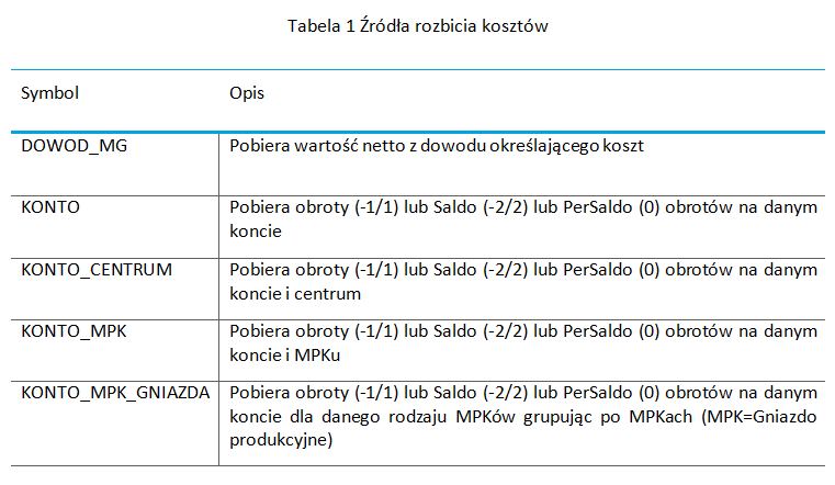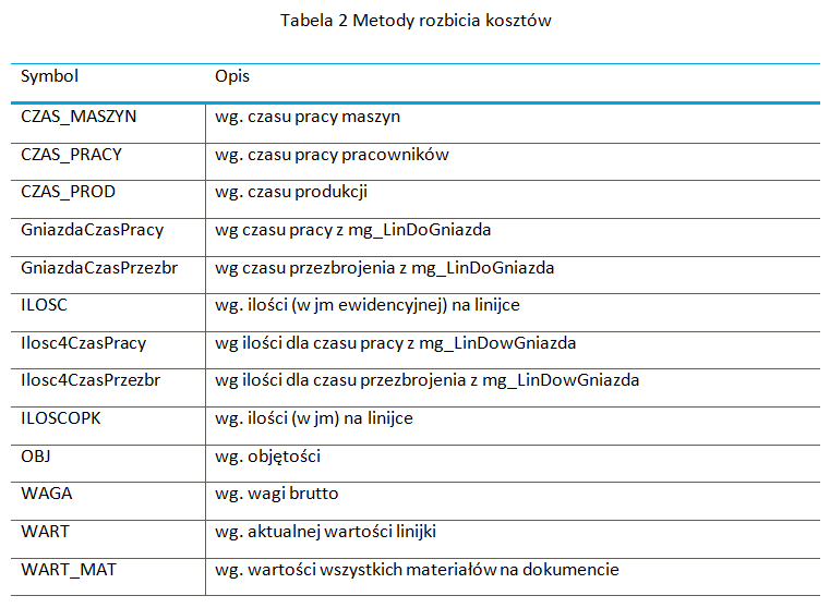 Kolejnym istotnym elementem konfiguracyjnym jest wybór sposobu podziału pobranych kosztów. Dostępne metody są przedstawione w tabeli: