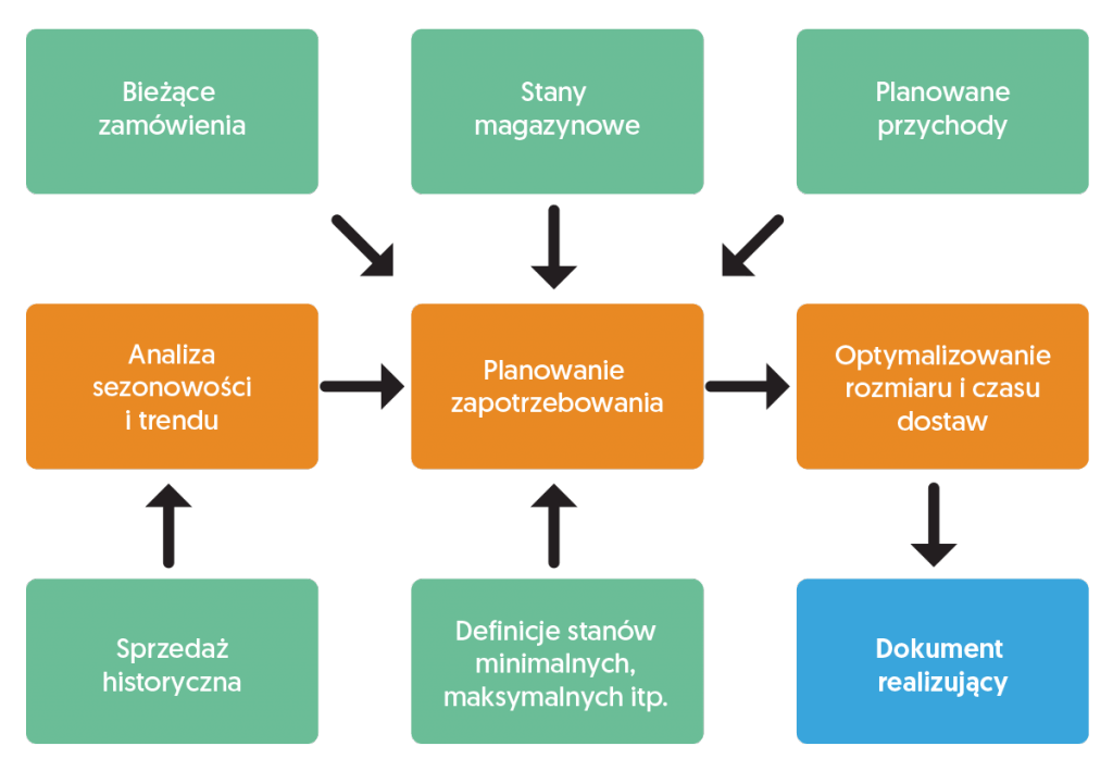 3. Następnie wyliczane jest zapotrzebowanie na towar jako różnica pomiędzy stanem planowanym na koniec okresu, a stanem minimalnym.