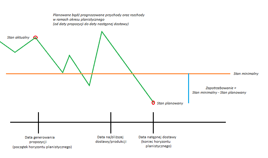 Algorytm zatem oblicza zapotrzebowanie na towar jako różnicę między stanem planowanym na koniec okresu planistycznego, a stanem minimalnym. Stan minimalny może być zerowy, może być statyczny lub wyliczany dynamicznie, zaś stan planowany może okazać się ujemny. Celem mechanizmu jest zaproponowanie takiej ilości dla najbliższej dostawy, aby przy kolejnej dostawie stan magazynowy spełniał zadane przez nas kryteria (przede wszystkim, aby był nie mniejszy od stanu minimalnego).