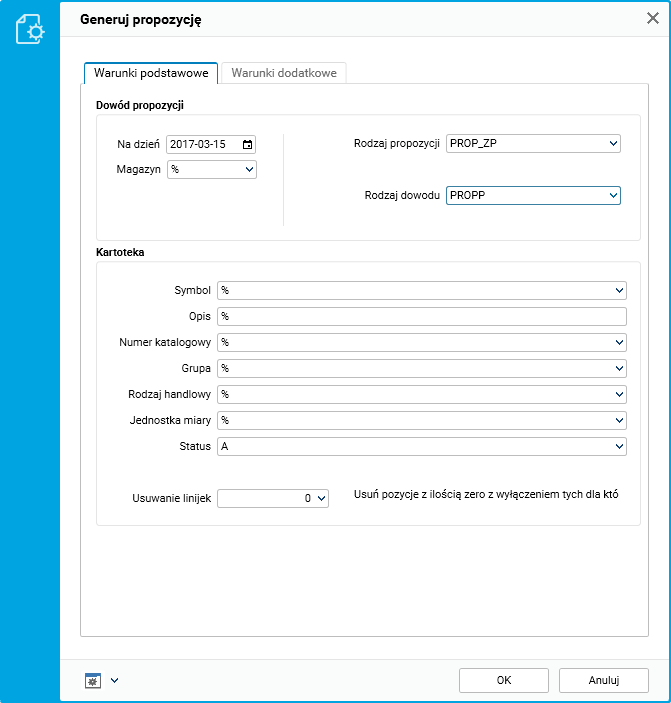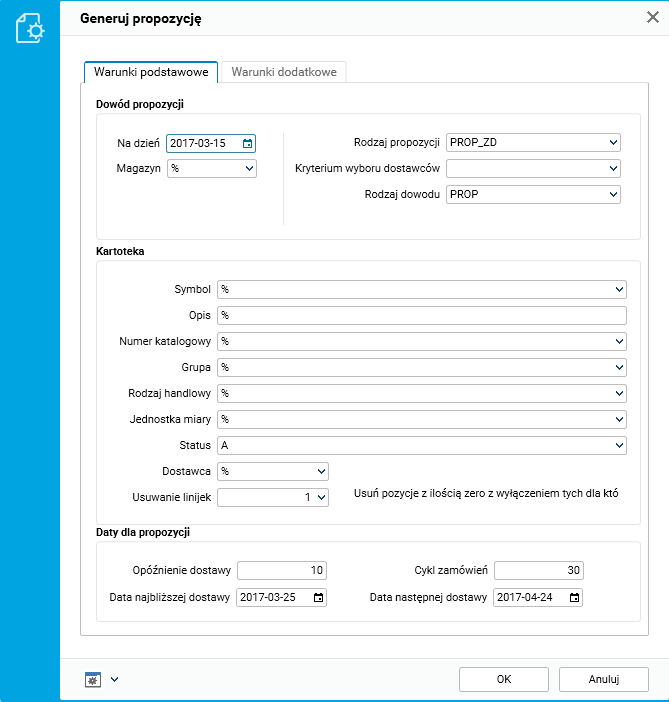 Rys. 4 Parametry dla procedury propozycji zamówienia