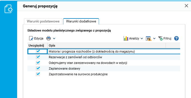 W procedurze należy wskazać model, który został wcześniej omówiony. Dodatkowo można ograniczyć pozycje surowcowe, dla których prowadzona jest analiza, wypełniając pozostałe pola. W zakładce warunki dodatkowe można wyłączyć niektóre elementy wchodzące w skład modelu prognostycznego.