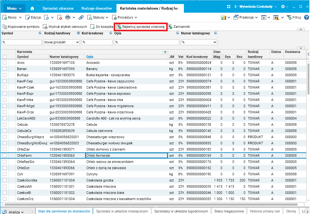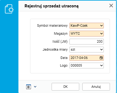 1. W słowniku Kartoteka materiałowa dodano procedurę „Rejestruj sprzedaż utraconą”, pozwalającą zarejestrować sprzedaż utraconą danego indeksu. Podczas uruchamiania tej procedury wskazujemy symbol materiałowy, symbol magazynu, datę oraz opcjonalnie – ilość, jaką klient zamierzał zamówić, a także logo kontrahenta. Symbole indeksu oraz magazynu inicjowane są na podstawie bieżącego wiersza, zaś ilość inicjowana jest wg. jednostki handlowej indeksu lub pozostawiana pusta. Dostępna jest możliwość zarejestrowania samego faktu wystąpienia sprzedaży utraconej bez podawania ilości towaru.